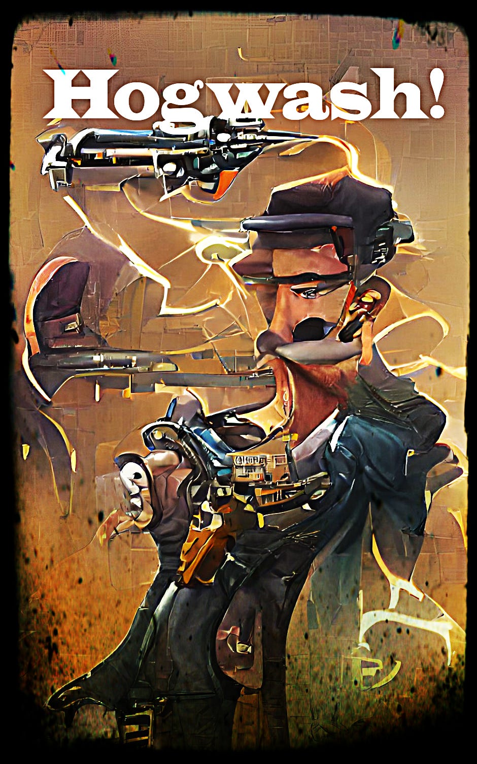 From the transom west comes the Hoawoshwogg, clad in black with dandy scarves and rivers of electric lead ready to make folks dead, heavy shooters long in the tooth and neck, etched with the lost words of makers dead from an ice age long gone, songs of independence, killing with a thought, given to the credence of this man's hands, bare beneath trim cuffs and intricate links. Each step shakes a tailfeather, a jingle-jangle of inevitability jutting out from rich snakeskin beneath fine wool. He breathes only in time with his steps, heart beating the drum of doom. Waxed moustache sculpted on a stiff lip, mouth pulled taut for years to make wrinkles there and down, like a permanent pucker. Each step is a funeral procession, every thought a dirge. And when the urge comes, the Hoawoshwogg arrives.