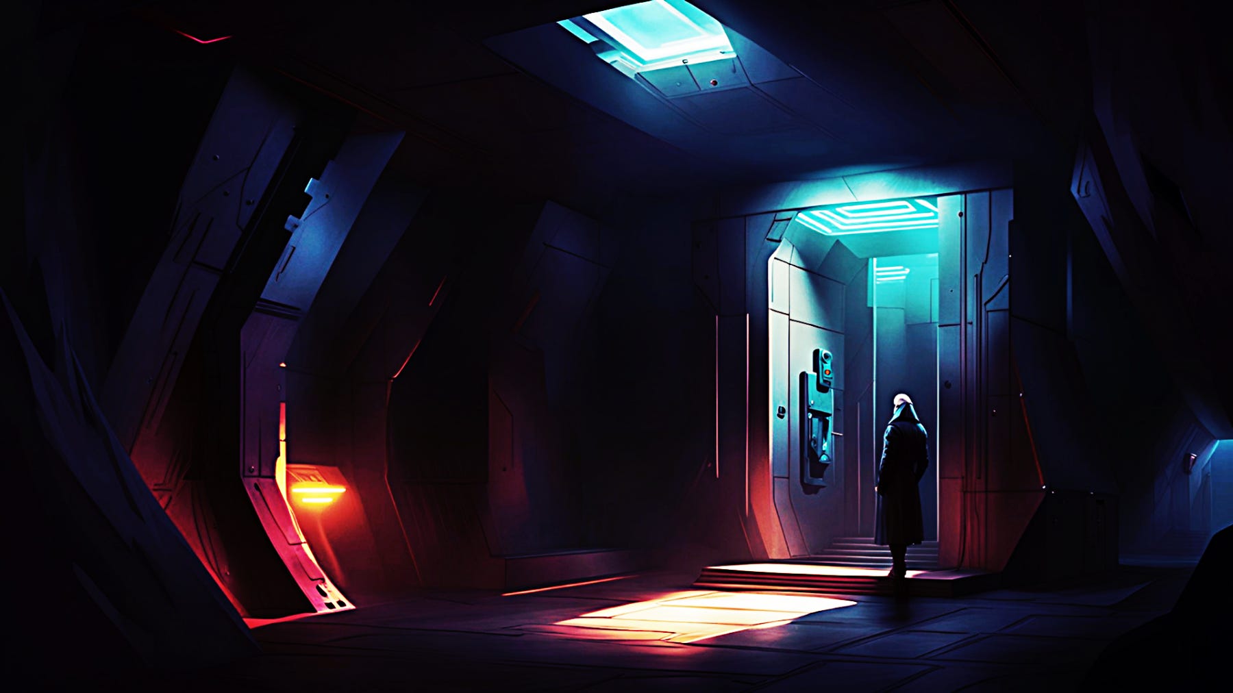 We continue down the hallway—which, as I said, is quite long. There is lighting on the floor: soft, ambient, bluish. All you can see ahead is more of the same.