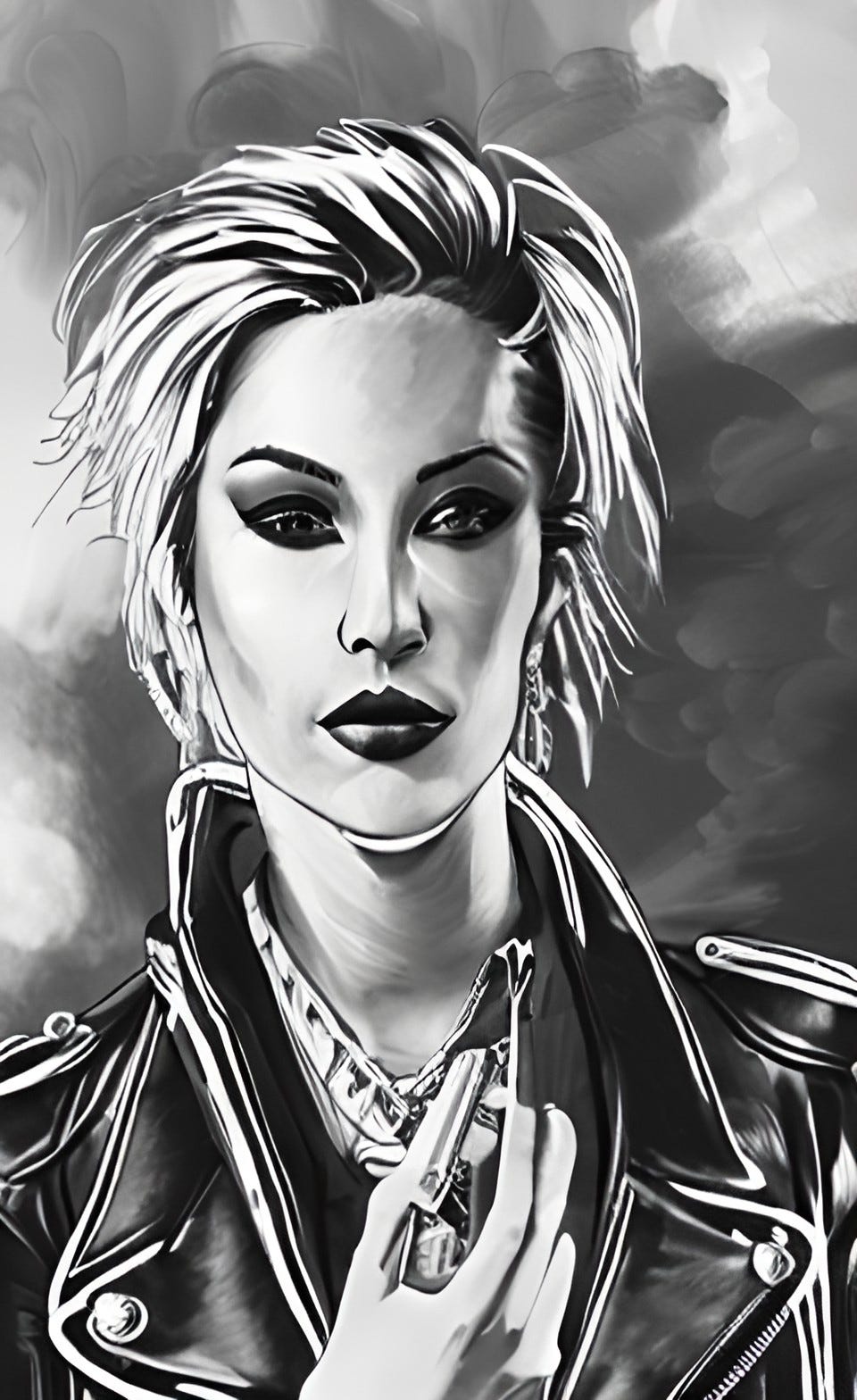 We exit the Brubaker and are walking down Main Street, when you catch sight of a tall woman with short platinum blonde hair in a black leather jacket. She’s surrounded by a cloud of smoke emanating from the cigarette between her lips.