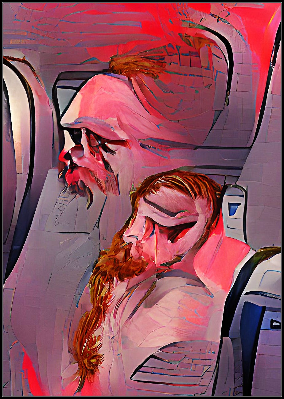 You board the plane, your body tired, eyes like burning coals in your head. The seats are tight and too small. The woman next to you is possessed by something, maybe a demon. You keep an eye on her as your body turns the pages of the magazine, adjusted the brightness of the monitor in the back of the headrest facing you, goes to the lavatory, puts on an eye mask and snores.