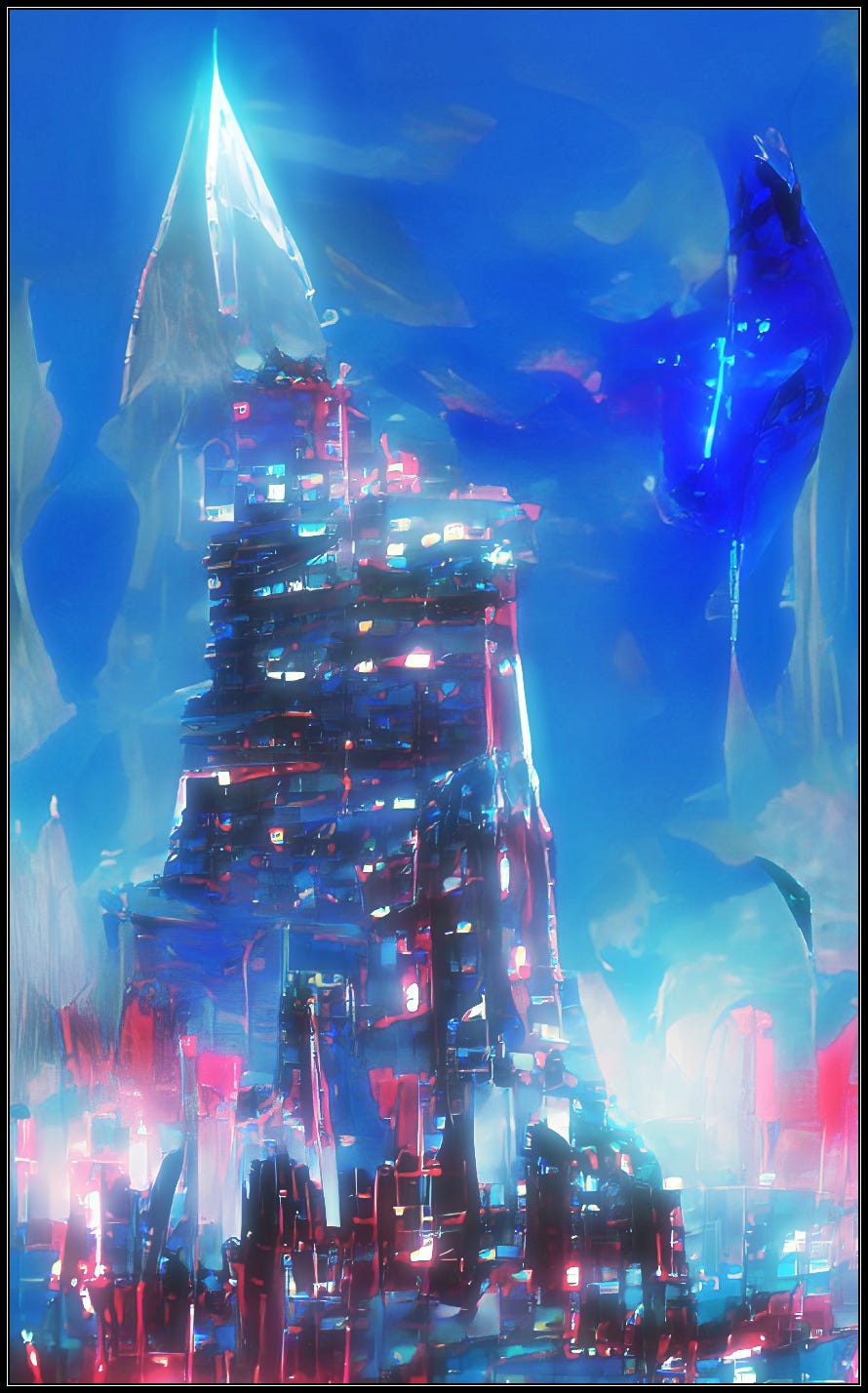 The Crystal Spire shines over the city, a blue light shimmering outward creating bright spots and shadows throughout the streets, over the river, out to the sea. You rest in its hum, feel the soothing of its calling, its rhythm, its pulse. The body likes it, too, moves to it, too, pleasures itself, moans and smacks flesh against the glass, reaching for it as you rest in serene repose.