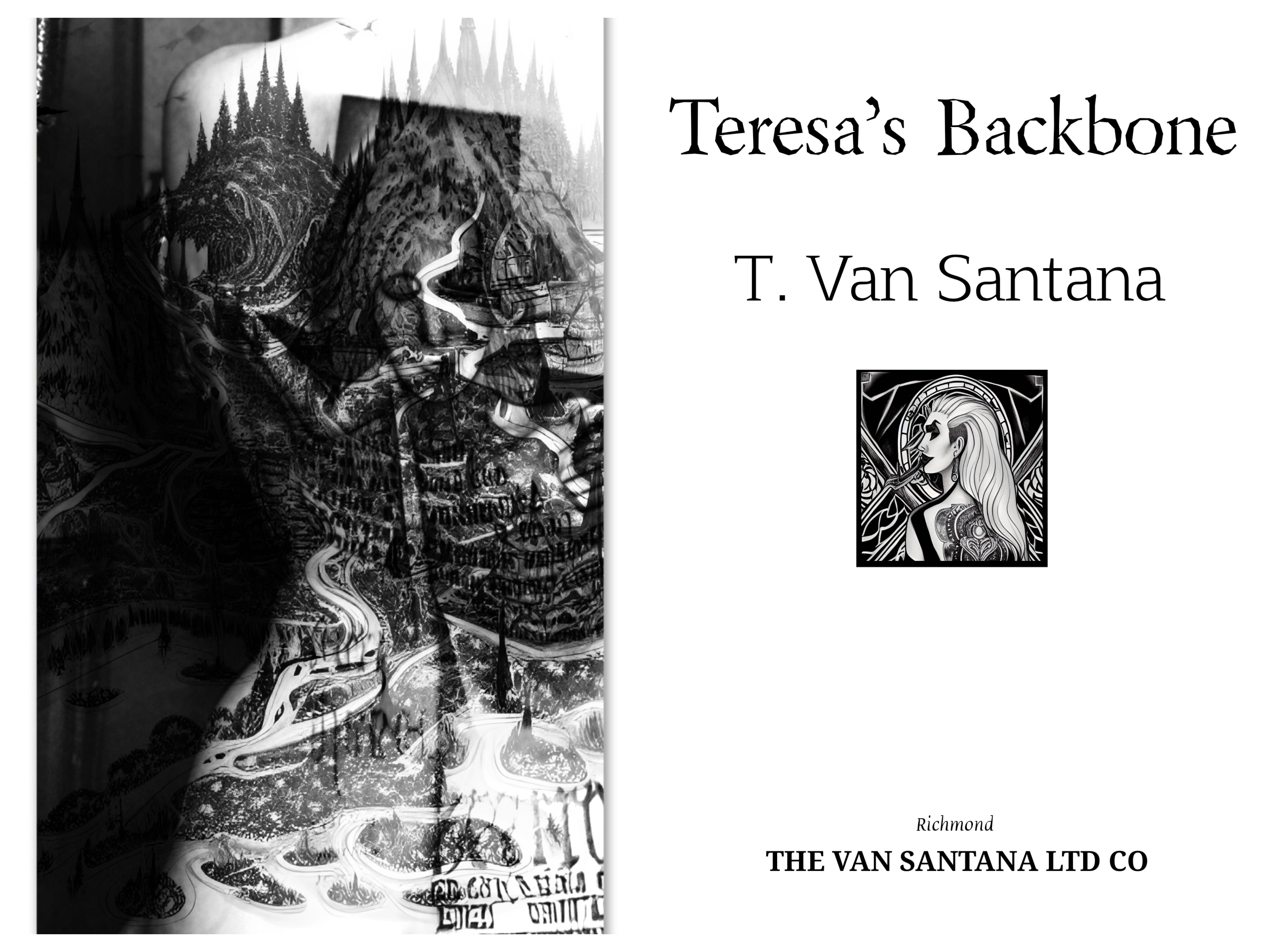 Opposite the map page is the title page. The book’s title is given in English: TERESA’S BACKBONE. Below that is the author’s name: TERESA VAN SANTANA. Then there is a black and white ink drawing style image of a feminine person with long, light hair with a left side undercut and a back tattoo visible between their hair and a black strap on their left shoulder. You take this to be Teresa Van Santana; me. At the bottom of the page is the location of the publisher: RICHMOND—which you know to be Richmond, Virginia, not London. Finally, right under that, is the name of the publisher: THE VAN SANTANA LIMITED COMPANY, which is my publishing company.