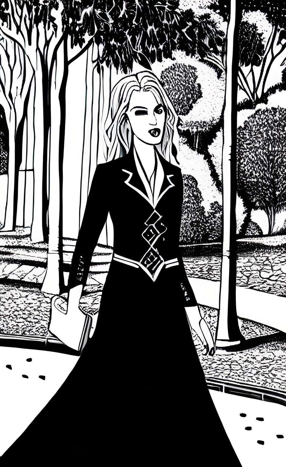 As we walk through the park, we notice a sweet looking woman with very long legs, a dark haired man in a stylish university coat, a cool looking person with razor cut hair, and then an open arch to a solitary garden.