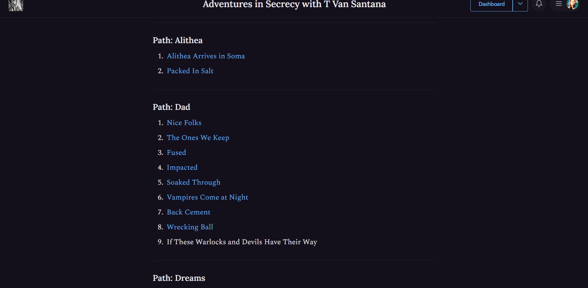 and then a subsection of chapters grouped by character, plotline, or theme, which I call ‘paths” as seen here: