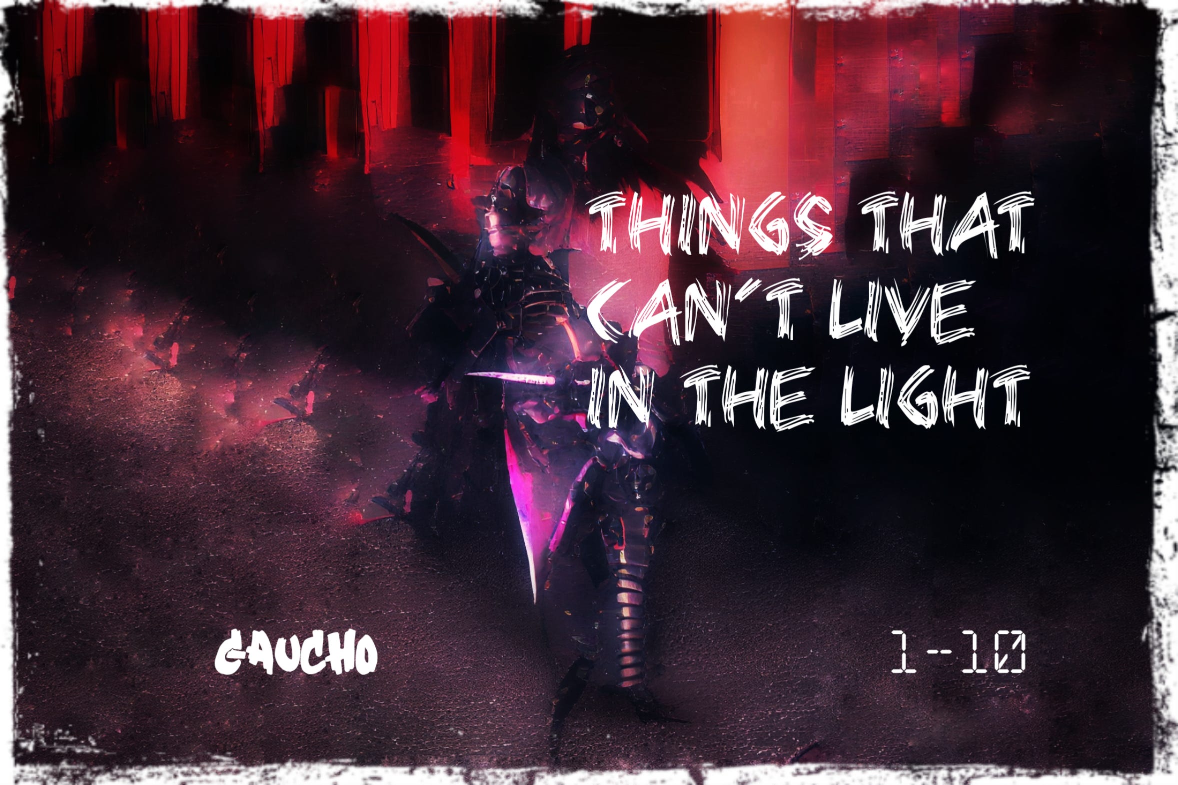 I look over my shoulder and see a figure there, long and tall, wide and dark, with metal thorns on her shoulders and knees. A gauntlet-clad hand pulls a blade from its scabbard. As the blade is emerging, the light is leaving.